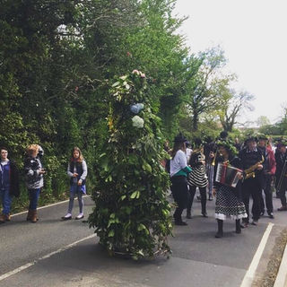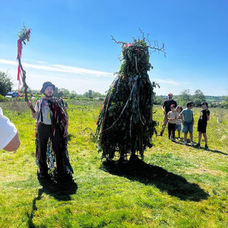 In addition to our regular groups, courses and workshops, we run a range of community events throughout the year including festive family activities and our environmentally friendly print workshops in the Green Crafts Village at Glastonbury Festival. Since 2019 we have produced Evercreech Jack in the Green, a contemporary folk revival celebration that takes place on the first Saturday in May in the village of Evercreech, bringing together the local community to welcome the arrival of summer through ancient tradition reimagined for modern times. The event begins with creative workshops where a ten-foot wicker Jack is dressed in flowers and foliage by volunteers, before being brought to life in a joyous procession through the village accompanied by musicians, drummers, morris dancers and followers. At the celebration field Jack is ceremonially "slayed" to release the Spirit of Summer—a joyful female icon who embodies the warmth and abundance of the season ahead. This nonprofit community event invites people of all ages to participate in flower crown making, music, dance and creativity. Everyone is welcome to join the procession and celebration.